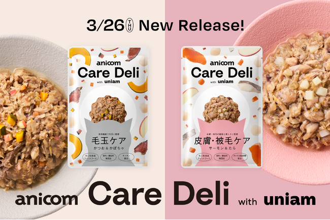 「ねこと生きるを、ユニークに。」をパーパスに掲げ、ねこ特化型ヘルスケアブランドを展開する株式会社uniam(本社:東京都港区、代表取締役CEO:杉本亜衣、以下当社)は、ペット保険シェアNo.1(※1)のアニコム損害保険株式会社のグループ会社であるアニコム パフェ株式会社(本社 東京都新宿区、代表取締役社長 安宅 快、以下 アニコムパフェ )と共同開発した機能性ウェットキャットフード「anicom Care Deli with uniam(アニコム ケアデリ ウィズ ユニアム)」において、新たに「皮膚・被毛ケア」「毛玉ケア」の2商品を、3月26日より販売開始いたします。
