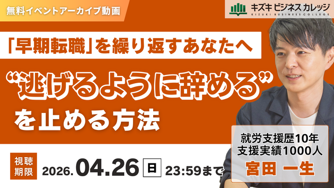 就労移行支援事業所・キズキビジネスカレッジ(KBC)は、2026年3月24日(火)に開催した、「早期転職」を繰り返さないためのオンラインセミナーの様子を収めたアーカイブ動画を無料公開いたします。