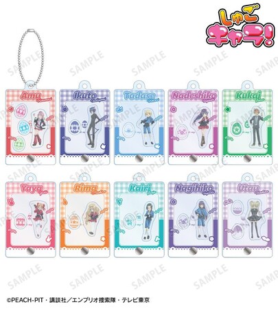 アクリルフレームの中に、日奈森 あむ、月詠 イクト、辺里 唯世、藤咲 なでしこ、相馬 空海、結木 やや、真城 りま、三条 海里、藤咲 なぎひこ、ほしな 歌唄のイラストと各キャラクターのモチーフを象った小さなパーツが入っている、パーツ付きフレームアクリルチャームです。