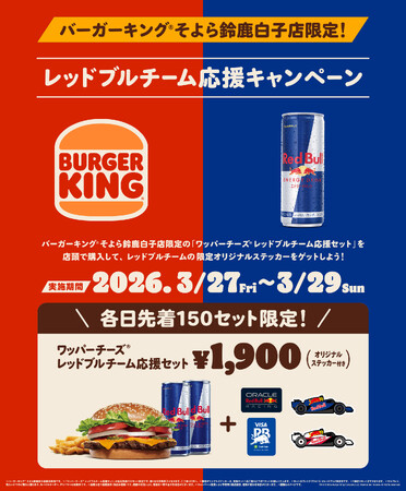 株式会社ビーケージャパンホールディングス(本社:東京都千代田区、代表取締役社長:野村 一裕)は、2026年3月27日(金)~3月29日(日)の3日間、バーガーキング(R) そよら鈴鹿白子店限定、各日先着150セット限定にて『ワッパー(R) チーズ レッドブルチーム応援セット』を発売いたします。本セットをご購入いただいたお客様へ、レッドブルチームのオリジナルステッカー4種セットをプレゼントいたします。