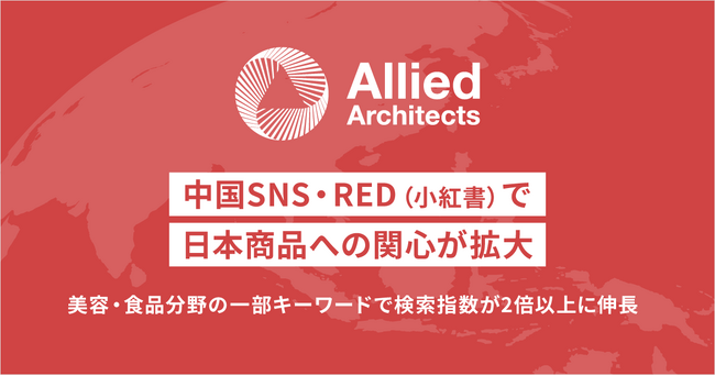 データとクリエイティブの力でマーケティングコミュニケーションを設計し、企業のマーケティングAXを支援するアライドアーキテクツ株式会社(本社:東京都渋谷区、取締役社長:村岡弥真人、証券コード:6081、以下「当社」)は、中国のSNS・RED(小紅書)上において、食品および美容ジャンルの日本商品に関連する検索・投稿を調査しました。その結果、一部キーワードで検索指数・投稿数の増加が見られ、検索指数では前期間比で約2倍以上となるものも確認されました。また、レビューや比較を含む投稿も確認され、日本商品に対する関心の高まりとともに、商品比較や情報収集など購買検討に近い行動の広がりが見受けられました。