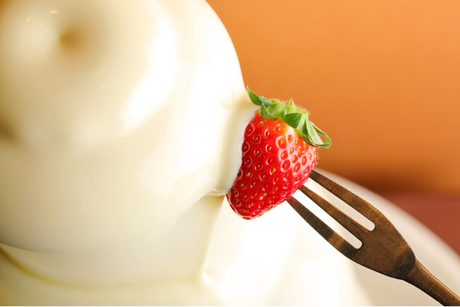 いちごとの相性が抜群なのが、真っ白に輝くホワイトチョコレートファウンテン。いちごをくぐらせれば、思わず写真に撮りたくなる可愛らしいビジュアルに。