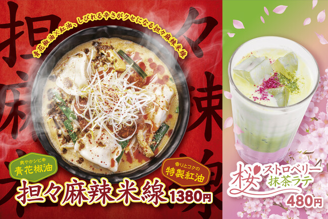 また、一足先に春を感じる、『桜ストロベリー抹茶ラテ』も同時販売しますので、 『担々麻辣米線』とともにお楽しみください。