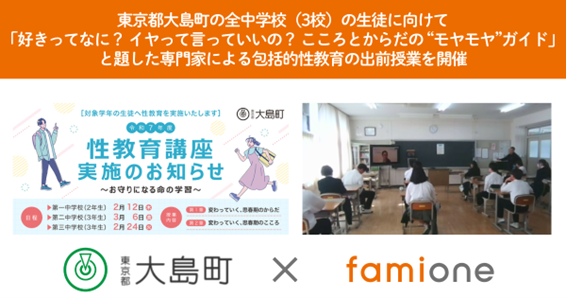 「子どもを願うすべての人によりそい 幸せな人生を歩める社会をつくる」をビジョンに掲げ、法人の従業員向け福利厚生や自治体の住民向け支援を行うヘルスケアサポートサービス「ファミワン」 https://famione.com/benefit/ などを展開する株式会社ファミワン(本社:東京都渋谷区、代表取締役:石川勇介)は、東京都大島町(町長:坂上長一、以下大島町)からの委託を受け、大島町内にある全ての公立中学校(第一中学校、第二中学校、第三中学校)を対象に、2026年2月12日(木)~3月6日(金)にかけて性教育講座「好きってなに? イヤって言っていいの? こころとからだの “モヤモヤ”ガイド 」を開催いたしました。