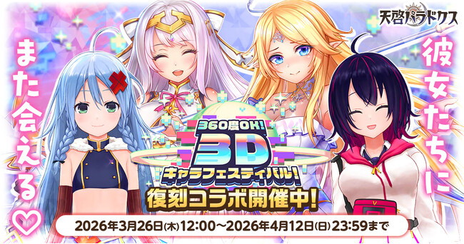 2026年3月26日(木)12:00より、3Dのキャラクター達が活躍する3タイトル「天啓パラドクス」「デタリキZ」「宝石姫Re」が集結した、トリプルコラボイベント【360度OK! 3Dキャラフェスティバル!(3Dフェス)】が復刻開催中です!