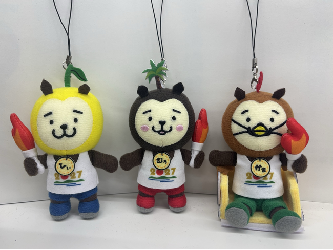 今回発売するのは、開催年「2027」をデザインしたランニングシャツを着た「ひぃくん」「むぅちゃん」「かぁくん」の3種類。国スポ・障スポを掲げたデザインや、車いすに乗った「かぁくん」など、本大会ならではの特別仕様となっています。