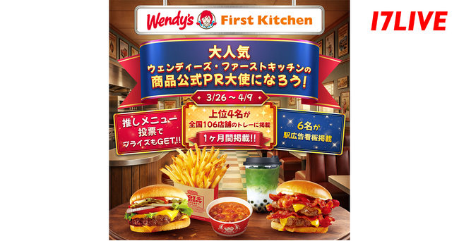 17LIVE株式会社(東京都渋谷区、代表取締役:ジャン・ホンフイ、URL:https://jp.17.live/)が運営する日本最大級のライブ配信アプリ「17LIVE(イチナナ)」は、幅広い世代から愛される大人気ファストフード店の商品公式PR大使就任や駅広告看板などへの掲載をかけたイベント、「大人気!『ウェンディーズ・ファーストキッチン』の商品公式PR大使になろう!」を、2026年3月26日(木)より開催することが決定しましたので、お知らせいたします。
