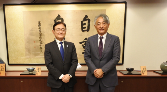京都大学 湊長博 総長(右)とNTT川添雄彦 チーフエグゼクティブフェロー(IOWN Global Forum President and Chairperson、左)=京都府京都市の京都大学