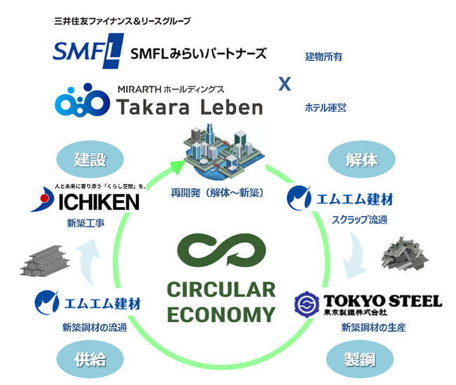 SMFLみらいパートナーズ株式会社(代表取締役社長:上田 明、以下「SMFLみらいパートナーズ」)、株式会社タカラレーベン(代表取締役:秋澤 昭一、以下「タカラレーベン」)、株式会社イチケン(代表取締役社長:長谷川 博之、以下「イチケン」)、東京製鐵株式会社(取締役社長:奈良 暢明、以下「東京製鐵」)、エムエム建材株式会社(代表取締役社長:温井 健夫、以下「エムエム建材」)の 5社は、鹿児島県霧島市において進行中の、旧「かごしま空港ホテル」の建替えプロジェクト「LEBEN HOTEL KAGOSHIMA AIRPORT」計画において、既存建物の解体に伴い発生する鉄スクラップを同ホテルの新築建材の原料として再利用する循環スキーム「資源のクローズドループの取り組み」(以下「本取り組み」)について合意したことをお知らせします。