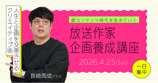 株式会社宣伝会議(本社:東京都港区/代表取締役社長:高橋 智哉)は、2026年4月25日(土)に、「超コンテンツ時代を生きていく 放送作家企画養成講座 長崎周成クラス」を開講します。 本講座は、放送作家を目指す方や、自分ならではの企画軸を確立し、ヒットを生み出したい方に向けて、長崎氏が自身の実例をもとに、人生経験を企画へ転換する方法と発想力を磨く1日集中講座です。