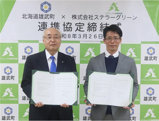 北海道雄武町(町長:高橋 健仁、以下「雄武町」)と森林カーボンクレジット創出の支援事業を展開する株式会社ステラーグリーン(本社:東京都中央区、代表取締役社長 兼 CEO:中村 彰徳、以下「ステラーグリーン」)は、2026年3月26日(木)にカーボンニュートラルの実現に向けた連携協定を締結しました。