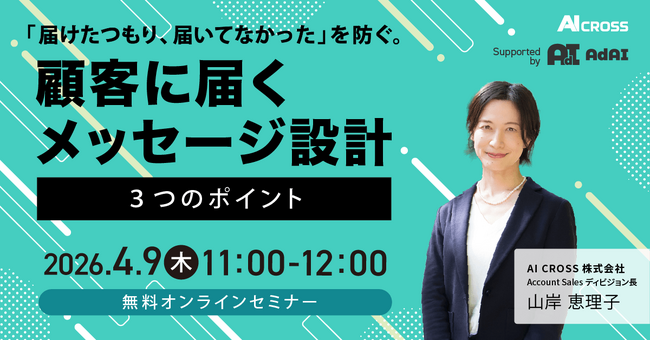 AI CROSS株式会社(本社:東京都港区、代表取締役CEO:原田 典子、以下「AI CROSS」)は、当社主催の無料オンラインセミナー「「届けたつもり、届いてなかった」を防ぐ。顧客に届くメッセージ設計3つのポイント」を2026年4月9日(木)11時より開催します。