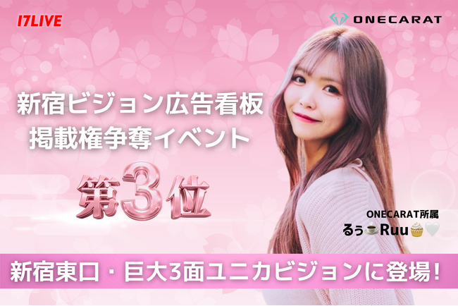 株式会社AEGIS GROUP(本社:東京都渋谷区)が運営するライバー事務所「ONECARAT(ワンカラット)」は、所属ライバー「るぅ ️Ruu????(ハート)」が、ライブ配信アプリ「17LIVE」内で開催された『新宿ビジョン広告看板掲載権争奪イベント』で3位に入賞したことに伴い、2026年3月23日より新宿のランドマーク的屋外ビジョン「ユニカビジョン」にて広告映像の放映を開始したことをお知らせいたします。