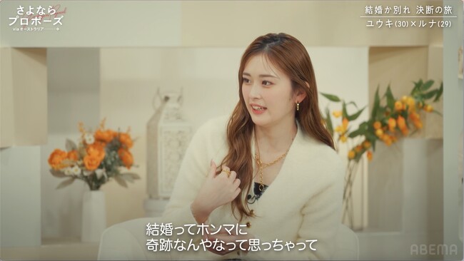 このやりとりを見たゆうちゃみは「結婚ってホンマに奇跡なんだなって思っちゃって、お互いのタイミングがちょっとでもズレることによって、結婚がなしになる可能性っていっぱいあんねやって思った」とポツリ。