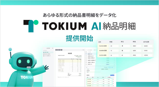 経理AIエージェントを提供する株式会社TOKIUM(本社:東京都中央区、代表取締役:黒崎賢一、以下「TOKIUM」)は、TOKIUM AI納品明細の提供を開始しました。納品書をアップロードすると、AIが品名や数量、金額など、任意の項目をデータ化します。データ化した納品書はCSV形式で出力でき、仕入管理システムなどへの取り込みが可能です。また、TOKIUM AI請求照合と併用することで、納品書のデータ化から照合までワンストップで完結できます。なお、本サービスはTOKIUM以外のシステムをご利用のお客様でも導入が可能です。