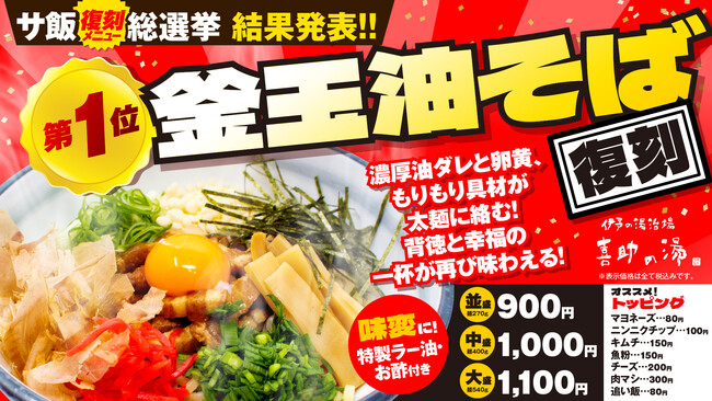 「Re:サ飯2025 人気投票」結果発表。第1位は「釜玉 油そば」 4月1日より復刻販売開始【愛媛県・喜助の湯】