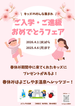 2026年4月1日(水)より、ご入学・ご進級おめでとうフェアを開催します!ささやかですが、よごしやま温泉からキッズ達へプレゼントをご用意しました♪