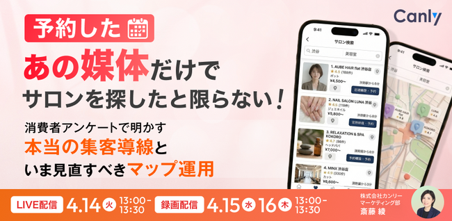 Google ビジネスプロフィール、Yahoo!プレイス、Appleマップなどの3大地図媒体、HP、アプリ、SNSなどの店舗集客媒体の一元管理サービス「カンリー店舗集客」の開発・提供を行う株式会社カンリー(所在地:東京都品川区、代表取締役:辰巳 衛,秋山 祐太朗)は2026年4月14日(火)・15日(水)・16日(木)の3日程で「予約した「あの媒体」だけでサロンを探したとは限らない! ~消費者アンケートで明かす "本当の集客導線" と、いま見直すべきマップ運用~」をオンラインで開催いたします。
