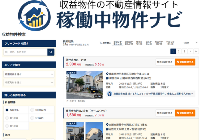 この度、空き家ビジネスを手掛ける地域共創スタートアップのクールコネクト株式会社(本社:群馬県伊勢崎市、代表取締役:神戸 翔太)は、すでに収益が出ている物件に特化した不動産投資情報サイト「稼働中物件ナビ」を公開したことをお知らせします。