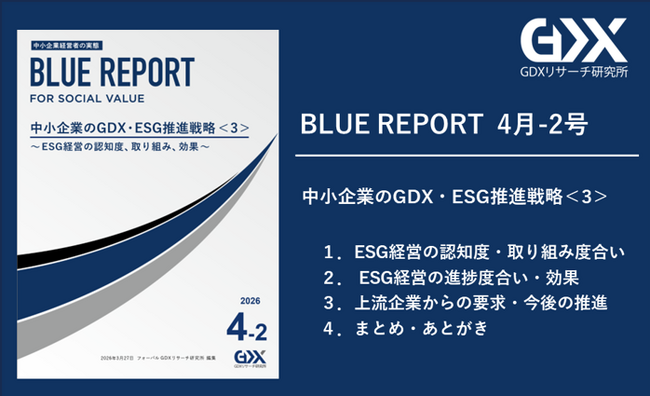 『「新しいあたりまえ」で、新しい世界を創るFORVAL』を理念に掲げる、次世代経営コンサルタント集団である株式会社フォーバル(本社:東京都渋谷区、代表取締役社長:中島 將典、以下「フォーバル」)が運営するフォーバル GDXリサーチ研究所は、中小企業のESG経営の認知度や取り組み状況から、進捗度合い、効果や課題、今後の推進意向などについて調査した「BLUE REPORT 4月-2号」を2026年3月27日(金)に発行いたします。