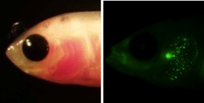 (注1)透明金魚:体に模様が無く白色の金魚であるミューズを元にエチルニトロソウレア(ENU)による点突然変異誘発技術により開発された。幼魚の段階では全身が透明で体内の様子が解剖しないでも観察できる。成魚になるにつれ白色色素が目立つようになり半透明となる。今回の実験では用いなかったが、ゲノム編集技術で白色色素を合成できなくした高度透明金魚系統も作出されている。