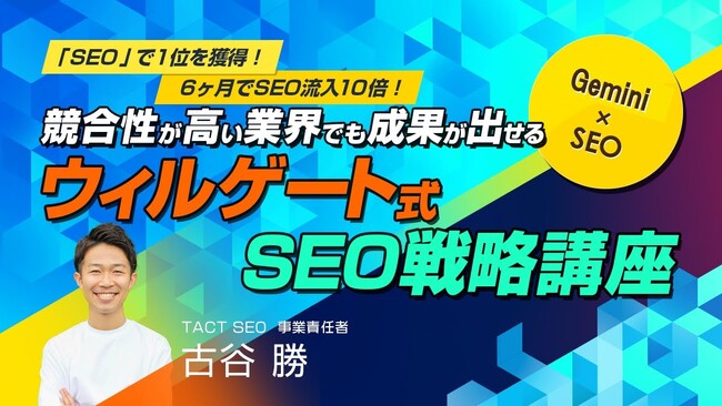 2006年の設立以来、SEOを起点にWebサイト集客からCV獲得のためのコンサルティング・設計・流通まで、全領域をワンストップでサポートしています。 SEOを中心に、CRO・SXO・LLMOなどのWebマーケティングのコンサルティングおよびコンテンツ制作サービスを提供。 2018年にリリースしたSEOの内製化を支援するSaaS「TACT SEO」は、導入企業7,000社を突破。競合調査やサイト分析などの順位改善をはじめ、AI(Gemini 2.5 Pro 対応)を活用して簡単にSEO記事を作成できます。■ウィルゲートについて