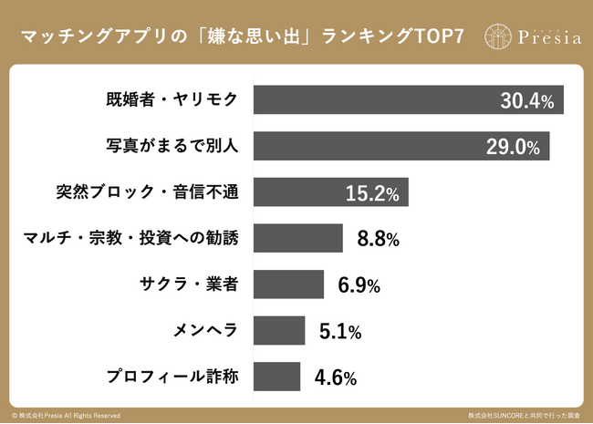 マッチングアプリ利用者230名が遭遇した「嫌な思い出」ランキングTOP7。1位は「既婚者・ヤリモク(30.4%)」、2位「写真詐欺(29.0%)」と僅差で続く