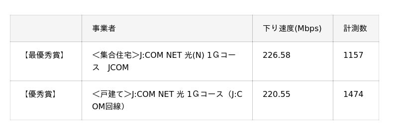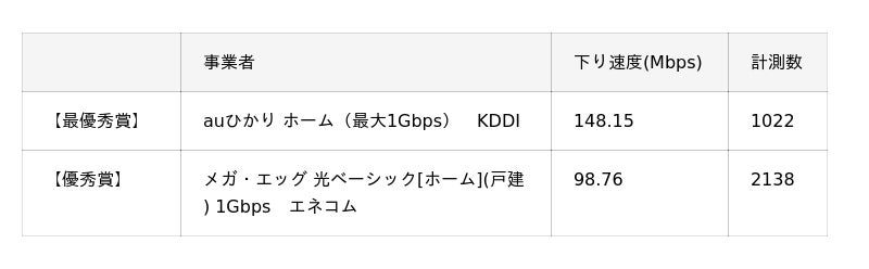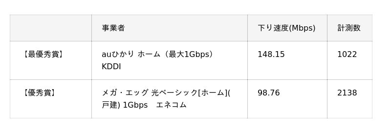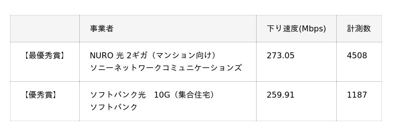 戸建てサービスの部(Wi-Fi)ではKDDIの「auひかり ホーム5ギガ」が、集合住宅(Wi-Fi)では「NURO 光 10ギガ(マンション向け)」が1位となりました。
