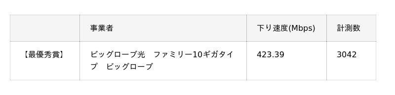 競合の激しい光コラボサービスではビッグローブ光の「ファミリー10ギガタイプ」が総合1位に輝きました。