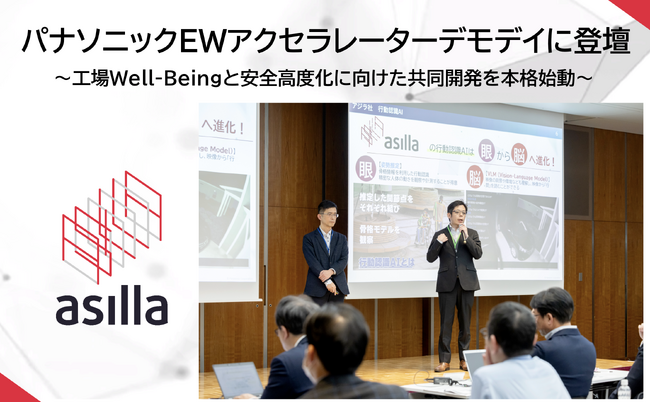 2026年3月18日(水)、パナソニック東京汐留ビルにて開催されたデモデイにおいて、パナソニックEW「ものづくり革新本部」とasillaによる共同プレゼンテーションを実施いたしました。 パナソニックEWの役員陣が審査員を務めるなか、採択テーマである「行動分析技術」を基軸に、製造現場の不安全行動や潜在リスクを可視化し、働く人のWell-being向上と工場の生産性向上を両立させる具体的な事業構想を発表しました。
