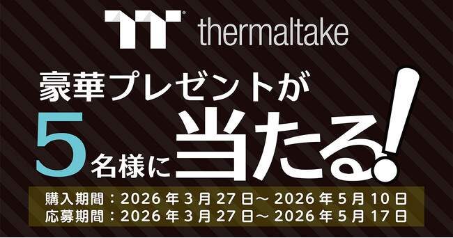 株式会社アスク(本社:東京都千代田区)は、2026年3月27日(金)~5月10日(日)までの期間、Thermaltake社製のミドルタワー型PCケース「Vision 330 CR ARGB」シリーズをご購入いただいた方を対象に、同社製水冷一体型CPUクーラー「TH360 V3 ARGB Sync」シリーズが抽選で5名様に当たるキャンペーンを実施いたします。