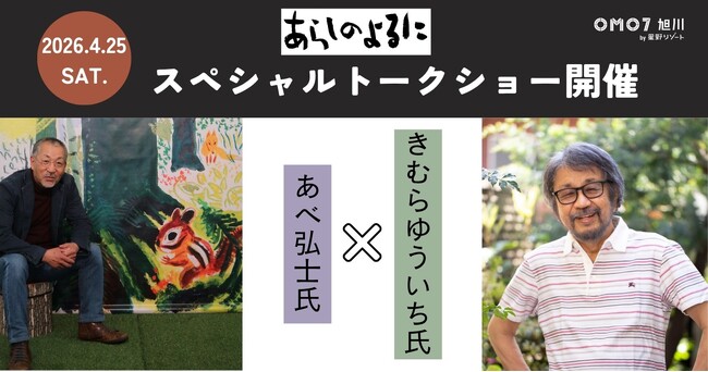 テンションあがる「街ナカ」ホテル「OMO7旭川(おも)by 星野リゾート」では、2026年4月25日(土)に「あらしのよるに」の著者である、あべ弘士氏(以下あべ氏)ときむらゆういち氏(以下きむら氏)が登壇する「スペシャルトークショー」を一夜限定で開催します。本企画では、トークショーと合わせて、「あらしのよるに」の上映や原画展、あべ氏ときむら氏のサイン会、物販などを通し、ここでしか体験できないトークショーを開催します。なお、原画展は2026年5月6日(水)まで開催するため、トークショー終了後も観ることができます。