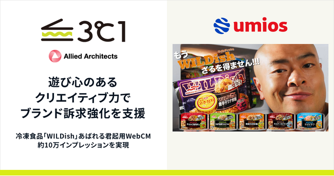 データとクリエイティブの力でマーケティングコミュニケーションを設計し、企業のマーケティングAXを支援するアライドアーキテクツ株式会社(本社:東京都渋谷区、取締役社長:村岡弥真人、証券コード:6081、以下「当社」)は、Umios株式会社(以下「Umios」※マルハニチロはUmiosへ社名変更いたしました)の冷凍食品ブランド「WILDish」の認知度向上施策において、当社のクリエイティブチーム「3℃1(サンドイッチ)」がタレント「あばれる君」を起用したWebCM制作を支援し、“従来のクリエイティブから少し路線を変えた、遊び心のあるハジけた動画”を創出、社内外から高い評価を獲得しました。