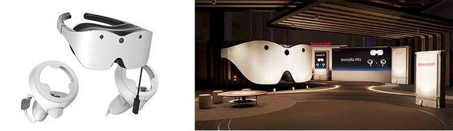 左:VRグラス「Xrostella VR1」と同梱のコントローラー、右:公式VR空間「SHARP Xrostella World」