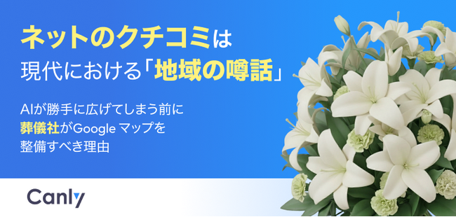 Google ビジネスプロフィール(TM)︎・HP・各SNSの一括管理サービス「カンリー店舗集客」の開発・提供を行う株式会社カンリー(所在地:東京都品川区、代表取締役:辰巳 衛,秋山 祐太朗)は、葬儀業界向けに「ネットのクチコミは現代における「地域の噂話」 AIが勝手に広げてしまう前に葬儀社がGoogle マップを 整備すべき理由」を無料公開しましたので、ご案内いたします。