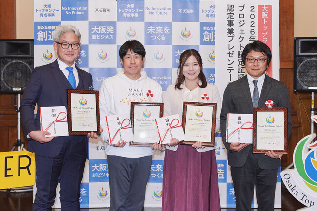 新規性があり成長が期待できる大阪の中小企業の有望プロジェクト4件を大阪市が認定。2026年3月25日(水)、大阪市中央公会堂にて認定証授与式及びプレゼンテーション会を実施しました。