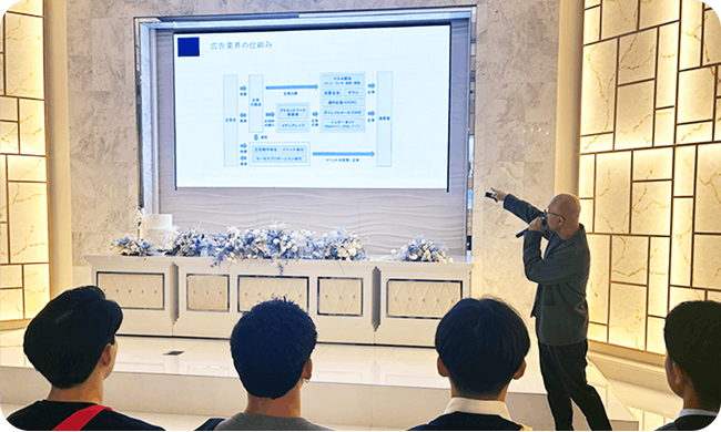 本イベントはGRIT人材と企業とのマッチングを目的とした会で、様々な大学・部活から多数の学生が参加。広告業界の仕組みや日本の富裕層の現状などについて、採用に関する質疑応答も含め講義を行いました。