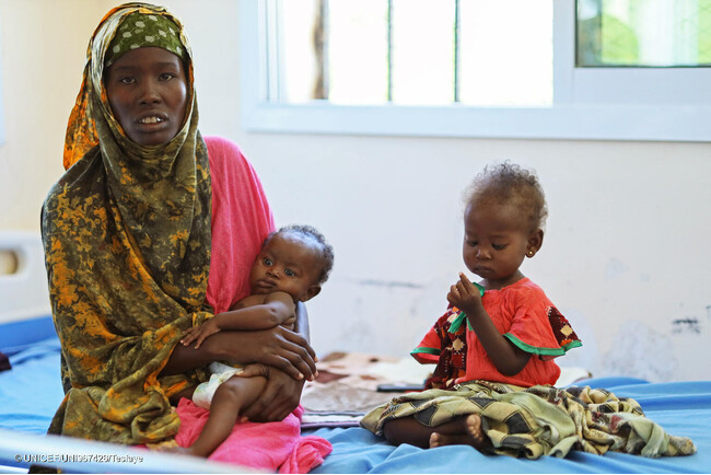 南部ドローの医療施設で重度の急性栄養不良と合併症の治療を受ける子どもたちと、付き添っている母親。干ばつによって、多くの人びとが生計手段である家畜と農作物を奪われた(ソマリア、2026年3月25日撮影)(C) UNICEF/UNI967428/Tesfaye
