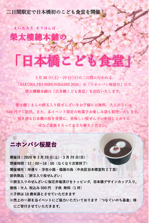 3月28日・29日に開催される「ニホンバシ桜屋台」にて、「日本橋こども食堂」を二日間限定で出店。お子様には無料、大人の方には税込500円で、餅玉入り桜ぜんざいをご提供いたします。