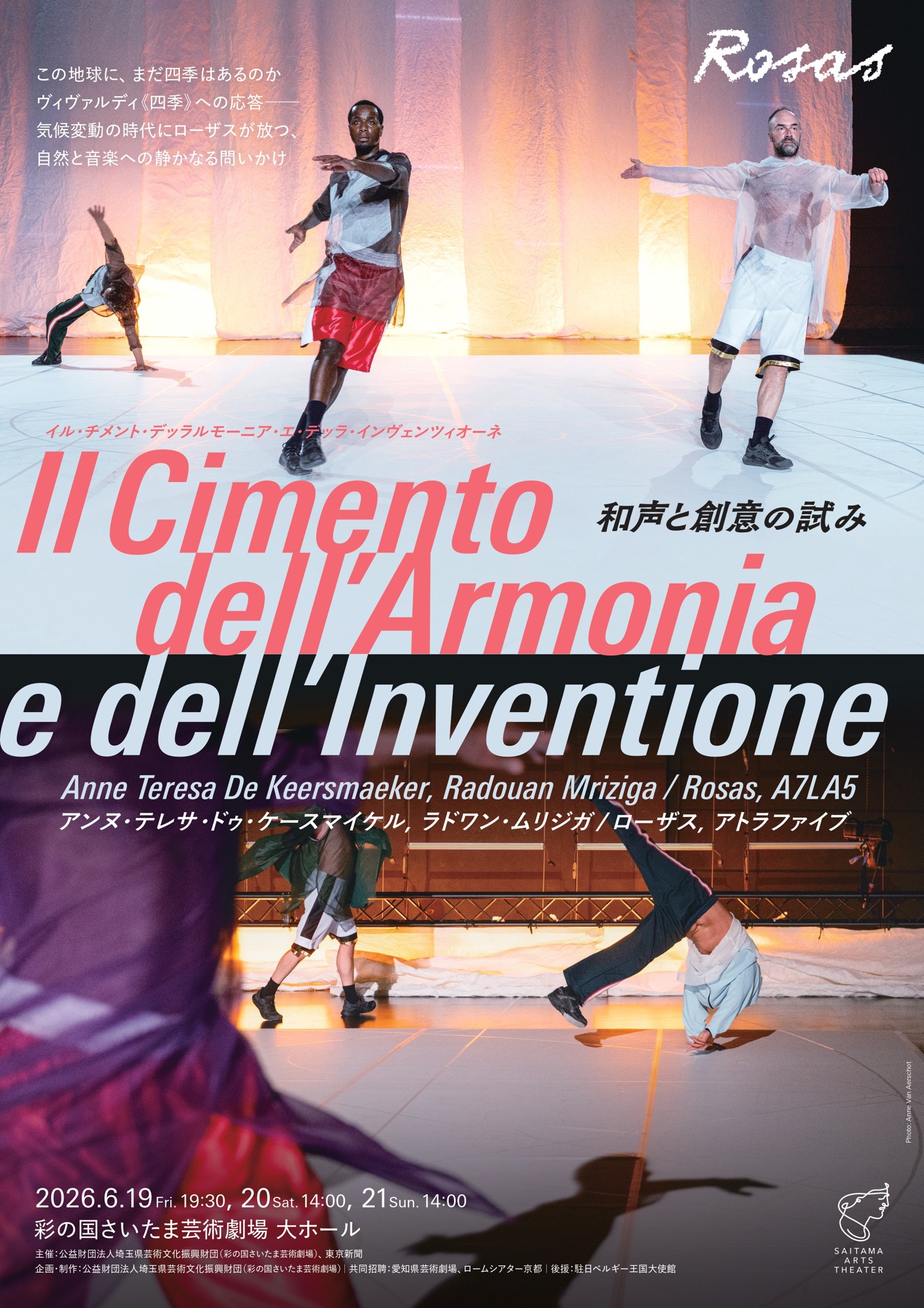 作中の終盤に流れる詩「We, the salvage」は、マルチメディアアーティスト、作家、映像作家のアスマー・ジャマが本作のために書き下ろしたもので、気候変動の脅威的な側面を描いています。この地球に、まだ四季はあるのか――アマンディーヌ・ベイエと彼女が率いるアンサンブル〈リ・インコーニティ〉が奏でる名盤《四季》とともに、いま私たちが直面する気候変動により、四季が失われつつある現実を詩的に問いかけます。7年ぶりの来日、そして彩の国さいたま芸術劇場には2010年の『3Abschied ドライアップシート(3つの別れ)』以来16年ぶりに登場となる<ローザス>の話題作にどうぞご期待ください。