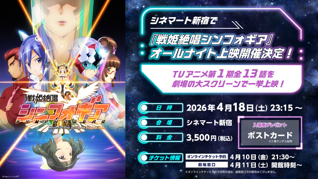 4月18日(土)23:15よりシネマート新宿にて、TVアニメ『戦姫絶唱シンフォギア』第1期全13話をオールナイトで一挙上映するイベントです。劇場の大スクリーンと音響環境で、シリーズの原点をぜひお楽しみください!