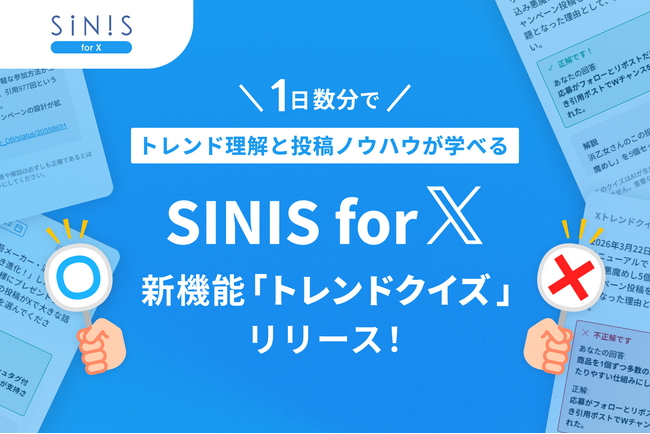 企業向け SNSマーケティング支援を中心としたビジネス展開をするテテマーチ株式会社(本社:目黒区、代表取締役:上田 大介)が運営するX分析・運用支援ツール「SINIS for X(サイニスフォーエックス)」は、X(旧Twitter)において、新機能「トレンドクイズ」を2026年3月26日にリリースします。
