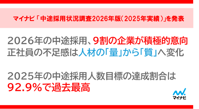 株式会社マイナビ(本社:東京都千代田区、代表取締役 社長執行役員:粟井俊介)は、中途採用業務を担当する企業の人事担当者1,500名に実施した、「中途採用状況調査2026年版(2025年実績)」の結果を発表しました。