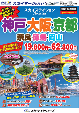スカイパックツアーズ株式会社(本社:東京都中央区、社長:横山正巳)は、スカイマークを利用した価格固定型のパンフレット旅行商品「スカイステイション 神戸・大阪・京都・奈良・徳島・岡山」【仙台空港発着】(2026年3月29日出発~2026年10月24日帰着)の販売を開始します。スカイマークだけを取り扱う専売店だからできるスペシャルプライス!早めのご予約がお得です。神戸空港を利用して神戸・大阪・京都・奈良・徳島・岡山を満喫♪