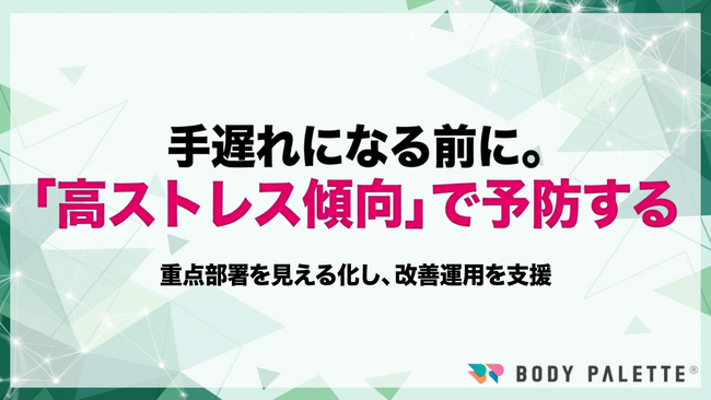 [画像4: https://prcdn.freetls.fastly.net/release_image/118106/98/118106-98-656fcba48738a5c9a8747478ac080aea-1920x1080.png?width=536&quality=85%2C75&format=jpeg&auto=webp&fit=bounds&bg-color=fff ]本プログラムは、高ストレス傾向比率を、集計条件と運用ルールを揃えたうえで、部門別・時系列で管理し、施策実行と検証までを支援します。