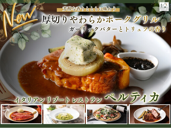 【イタリアン リゾート ペルティカ】自分への贅沢に♪とろけるガーリックバターの誘惑!五感を揺さぶるペルティカ渾身のグリル「厚切りやわらかポークグリル ガーリックバターとトリュフの香り」が新登場!
