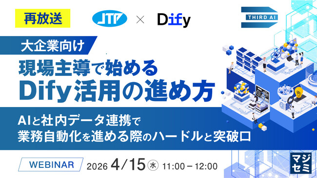 マジセミ株式会社は「【再放送】【大企業向け】現場主導で始めるDify活用の進め方」というテーマのウェビナーを開催します。