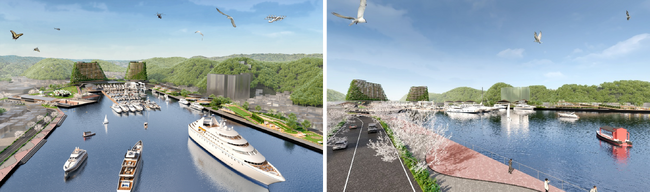 ※掲載の完成予想図(パース)は、事業提案時点におけるイメージであり、実際の計画内容とは異なる場合があります。今後の関係者協議、設計の進捗、各種許認可手続き等により、配置・形状・規模・仕様等は変更となる可能性があります。また、周辺環境・景観・植栽・船舶等はイメージであり、実際とは異なる場合があります。