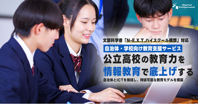 IT関連およびデジタルコンテンツの人材養成スクール・大学・大学院を運営するデジタルハリウッド株式会社(本社:東京都千代田区、代表取締役社長兼CEO:藤井雅徳、学長:杉山知之)は、文部科学省が推進する「高等学校DX加速化推進事業(DXハイスクール)」の取組を踏まえ、次世代の高校教育モデル創出を目的とした文部科学省「N-E.X.T.ハイスクール構想(産業イノベーション人材育成等に資する高等学校等教育改革促進事業)」に対応した高校教育の総合支援サービスを新たに提供開始します。