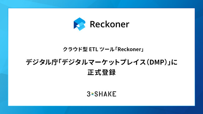 株式会社スリーシェイク(本社:東京都中央区、代表取締役社長:吉田 拓真、以下スリーシェイク)が提供するクラウド型ETLツール「Reckoner(レコナー)」は、デジタル庁が運営する行政機関・自治体向けのSaaS調達支援プラットフォーム「デジタルマーケットプレイス(DMP)」に登録されたことをお知らせします。